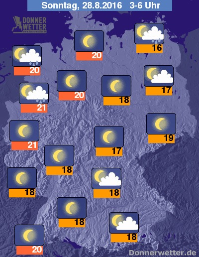 In der Nacht zum Sonntag ziehen über den Nordwesten und die Küstengebiete von Nord- und Ostsee häufig dichte Wolken hinweg, dabei bilden sich gebietsweise Schauer und lokal sind auch Gewitter möglich. Teils dichte Wolken mit vereinzelten Schauer und Gewitter sind auch am Alpenrand möglich, im großen Rest des Landes präsentiert sich der Himmel hingegen meist sternenklar und es bleibt trocken. Die Temperatur sinkt auf tropisch warme 21 Grad in Aachen und bis etwa 16 Grad an der Müritz.