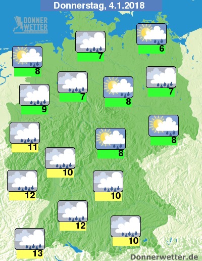 Im Süden und Südwesten fällt aus kompakter Schichtbewölkung nochmals teils ergiebiger Dauerregen mit weiter steigenden Pegelständen. Hier wird es mit 10 bis 13 Grad auch am mildesten. Sonst bleibt es abgesehen von kurzen Auflockerungen ebenfalls häufig stark bewölkt, Regen oder Schauer treten jedoch nur gelegentlich auf. Im Nordosten zeigt sich auch für einige Zeit die Sonne. Die Temperaturen liegen meist zwischen 6 und 10 Grad. Der Wind flaut insgesamt ab.