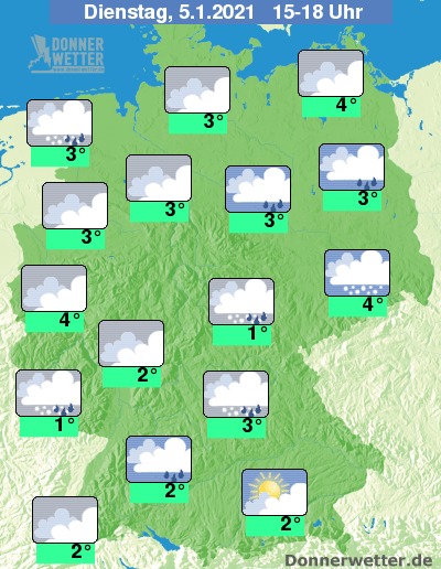 Am Dienstagnachmittag bleibt der Himmel über weiten Teilen des Landes bedeckt, einzelne Auflockerungen beschränken sich in den kommenden Stunden auf das Alpenvorland. Mit Niederschlägen, in die in den Mittelgebirgen auch als Schnee fallen können, muss vor allem in der Süd- und Osthälfte gerechnet werden. Im Küstenumfeld fallen einzelne Schauer meist als Regen oder Schneeregen.