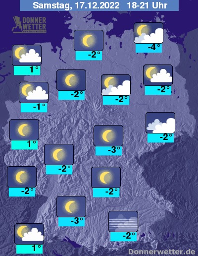 Heute Abend zeigt sich der Himmel zumeist sternenklar, hier und da ziehen lockere Wolkenfelder durch. Im Osten halten sich gebietsweise auch dichte Wolken, dazu bleibt es trocken. Die Temperatur liegt bei -4 Grad in Stralsund und 1 Grad in Freiburg.