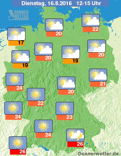 Heute Nachmittag ziehen im Alpenvorland gebietsweise dichte Quellwolken auf, dazu sind einzelne Schauer oder Gewitter möglich. Im übrigen Bundesgebiet ist es hingegen verbreitet heiter bis sonnig. Im Norden ist es auch zum Teil aufgelockert bewölkt, es bleibt aber trocken. Die Temperatur steigt auf 17 Grad im nördlichen Emsland und bis 26 Grad am Bodensee.