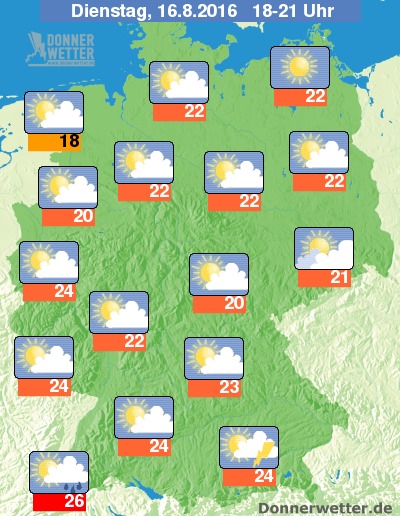 Heute Abend sind in Alpennähe hier und da einzelne Schauer und Gewitter unterwegs. Im übrigen Bundesgebiet ist es hingegen verbreitet nur leicht oder locker bewölkt, besonders im Küstenumfeld von Nord- und Ostsee ist es sonnig, dabei bleibt es trocken. Die Temperatur liegt anfangs noch bei 18 Grad in Emden und um 26 Grad in Konstanz.