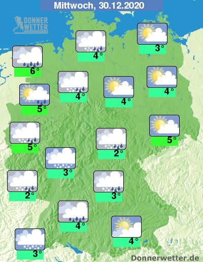 Sowohl im Norden und dort wo Frankreich nahe ist fällt am Silvestertag teilweise Regen oder Schneeregen, im Schwarzwald und im Hunsrück auch Schnee. In den anderen Gebieten wechseln sich Wolken mit gelegentlichen Sonnenstrahlen ab.