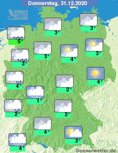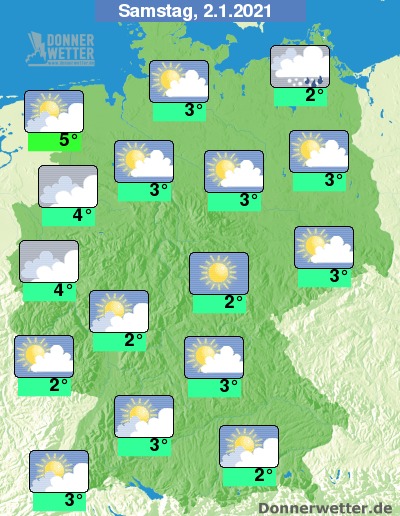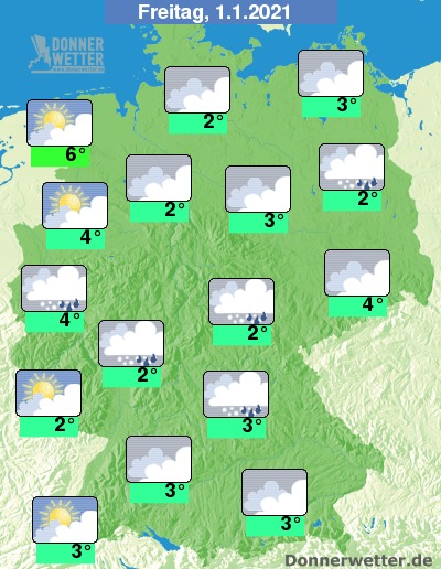 An Silvester im Westen Niederschläge in Form von Regen und Schneeregen, im Bergland Schnee mit Glättegefahr. Nach Osten hin auch Aufheiterungen. Über Sachsen verbreitet sonnig.