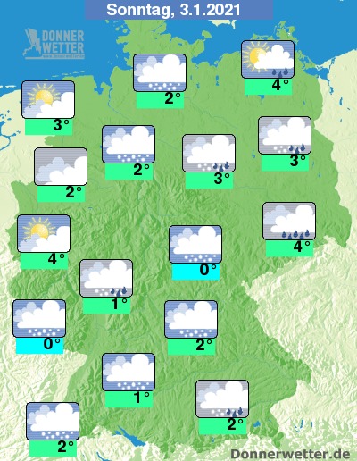 Am Neujahrstag fällt zunächst gebietsweise Regen oder Schneeregen, oberhalb etwa 200 bis 400 Meter meistens Schnee mit Glättegefahr. Im Tagesverlauf werden die Niederschläge seltener. Im Münsterland und an der Ems gibt es kurze freundliche Phasen.