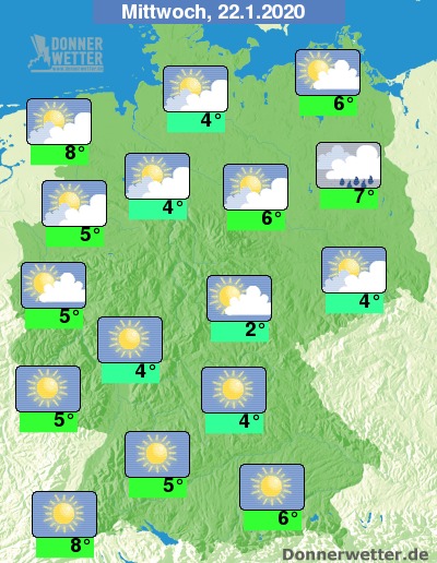 Über den Norden ziehen zunächst kompakte Wolken hinweg, aus denen zum Teil auch etwas Regen oder örtliche Schauer fallen können. Später lockert die Bewölkung auf. Im übrigen Land herrscht abgesehen einiger teils zäher Nebelfelder oder tiefhängender Bewölkung oft freundliches Wetter mit blauem Himmel und reichlich Sonnenschein.