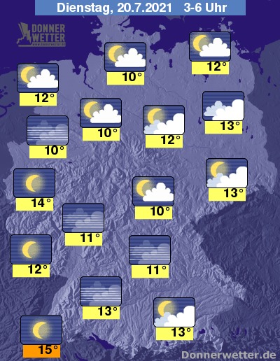 In der Nacht zum Dienstag zeigt sich der Himmel über der Republik zum Großteil sternenklar. Einige, oft auch dichte Wolken halten sich allerdings über dem Norden des Landes und über Sachsen, dazu bleibt es trocken. Die Temperatur sinkt auf 15 Grad in Freiburg und bis 10 Grad in Hamburg.