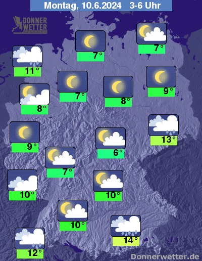 In der Nacht auf Montag fällt im Süden und Südosten teils anhaltender und ergiebiger Regen, auch lokale Gewitter können nicht ausgeschlossen werden. Auch an der Nordseeküste sind einzelne Niederschläge möglich. In den übrigen Landesteilen bleibt es bei geringer Bewölkung oder sternenklarem Himmel trocken.