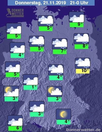 Am Abend regnet oder nieselt es in der Nordosthälfte zeitweise. Sonst bleibt es oft wolkenverhangen aber trocken. Im Süden zeigen sich stellenweise Mond und Sterne.