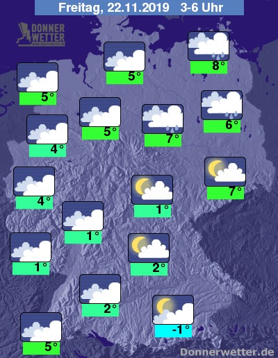 Bis zu den Frühstunden kühlt die Luft allgemein auf 1 bis 5 Grad ab, milder bleibt es nordöstlich der Elbe, leichter Frost droht an den Alpen.