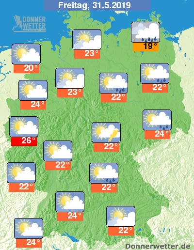 Zunächst halten sich meist noch dichtere Wolkenfelder. Im Nordosten und Osten fällt dabei noch gelegentlich Regen oder es gehen Schauer nieder, über den Mittelgebirgen auch örtliche Gewitter. Im Westen setzen sich im Tagesverlauf immer größere Aufheiterungen durch.