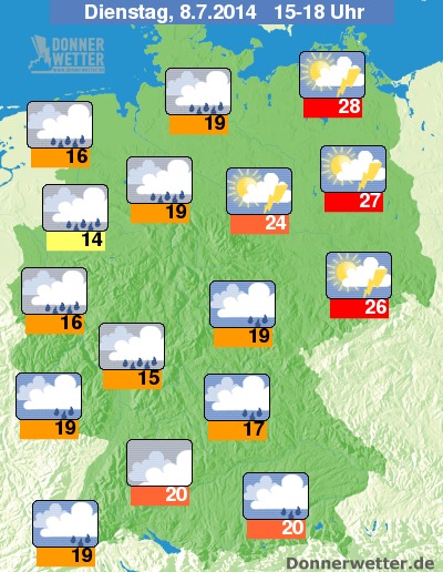 Heute Nachmittag ist es im Nordosten und Osten vielfach schwülwarm und bei 24 bis 28 Grad entladen sich immer wieder gewittrige Schauer. Vom Nordwesten, über den Westen bis nach Süden herrscht dagegen kühles Regenwetter bei Temperaturen von nur 14 Grad am Niederrhein und 20 Grad in Karlsruhe.