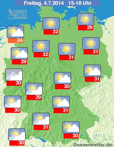 Heute Nachmittag bleibt es in der Nordosthälfte des Landes weitgehend heiter bis sonnig und trocken. Währenddessen ziehen von Südwesten zunehmend dichtere Wolken auf, so dass zum Public Viewing um 18 Uhr vor allem im Südwesten mit zum Teil kräftigen Gewittern gerechnet werden muss. Dabei können regional Sturmböen, großer Hagel und ergiebiger Regen auftreten. In der Nordosthälfte sollte einem tollen Public Viewing Abend aber nichts im Wege stehen. Die Temperaturen liegen bei 24 Grad in Ostfriesland und 32 Grad im südlichen Brandenburg.