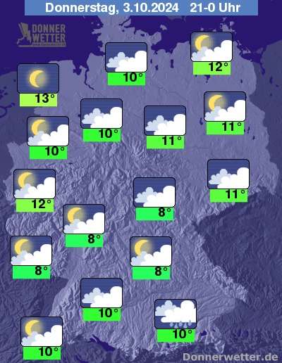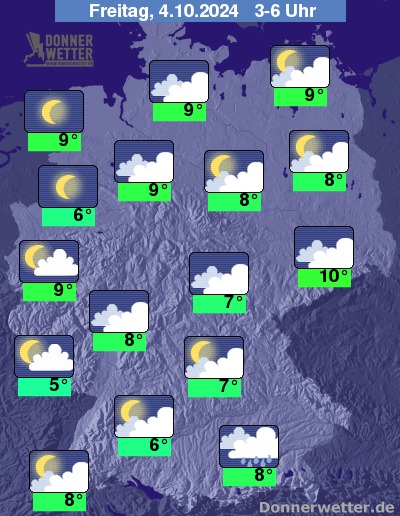 In der Nacht zum Freitag ist der Himmel über dem Norden und Westen nur gering bewölkt oder sternenklar, sonst ist es wolkig bis stark bewölkt. In Alpennähe fällt Regen, oberhalb von 1500 m in Schnee übergehend, sonst bleibt es weitgehend niederschlagsfrei.