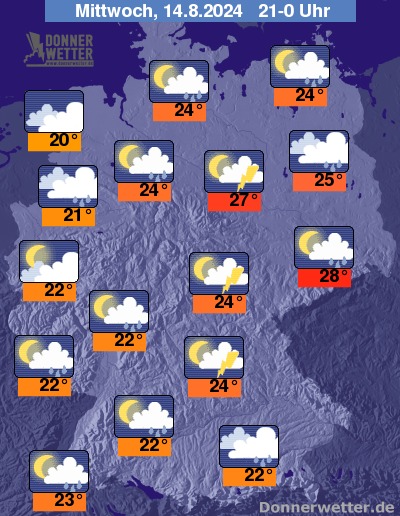 Am Mittwochnachmittag zeigt sich der Himmel östlich der Weser sowie im Südosten heiter bis wolkig oder aufgelockert bewölkt und es bleibt meist trocken. In den übrigen Landesteilen überwiegt am Nachmittag wechselnde oder starke Bewölkung, im Westen und Nordwesten muss dabei zeitweise mit schauerartigem und teils gewittrigem Regen gerechnet werden. Lokal besteht Unwettergefahr durch Starkregen!