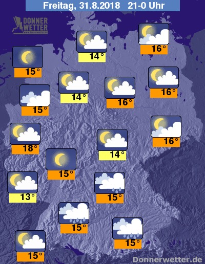Am Abend bleibt es im Norden und in der Mitte teils freundlich, teils bewölkt, aber meist trocken. Die Tempearturen pendeln im Bereich der 20 Grad - Marke.