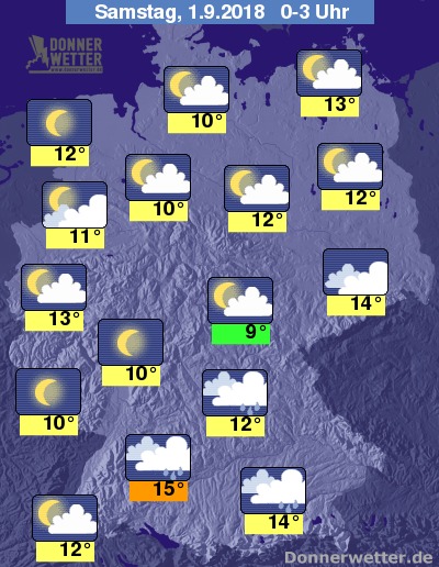 Auch nach Mitternacht fällt im Süden gebietsweise noch etwas Regen. Sonst zeigen sich regional für längere Zeit die Sterne. In der kühleren Luft können sich vor allem an Gewässern und in Senken einige Nebelfelder bilden. Die Temperaturen gehen auf 9 bis 13 Grad zurück. Nur unter den dichten Wolken bleibt es etwas milder.