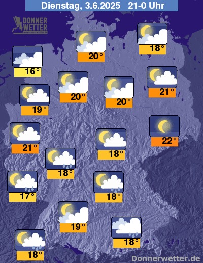 Am Dienstagnachmittag zeigt sich der Himmel über der Nordhälfte häufig heiter und es bleibt trocken. In den südlichen Landesteilen ist es wechselnd oder stark bewölkt, dabei muss zeitweise mit Schauern und Gewittern gerechnet werden, lokale Unwetter nicht ausgeschlossen.
