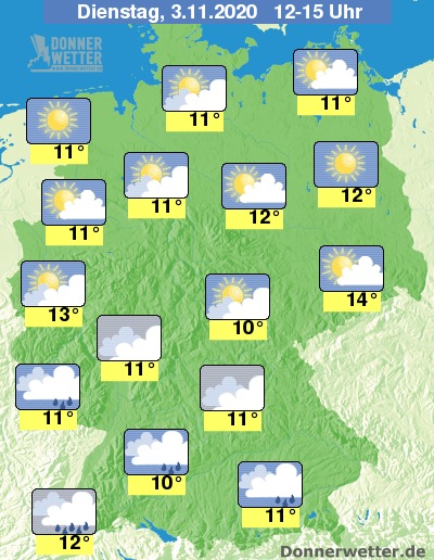 Bis zum frühen Abend ändert sich an der Wetter- und Temperaturverteilung in den meisten Regionen nicht wirklich viel. Der Regen im Süden dehnt sich allerdings bis zum Bayerischen - Wald aus und am Abend können im Nordwesten örtliche Schauer hereinziehen.