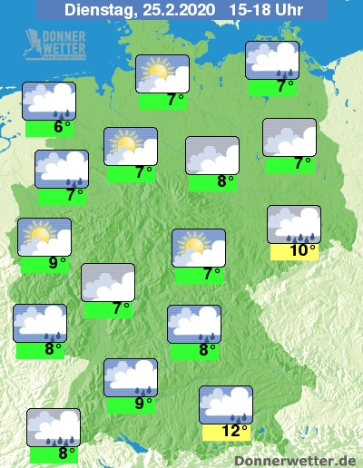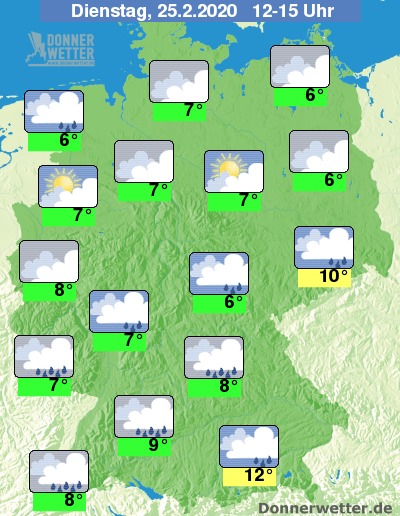 Am frühen Nachmittag fällt in der Südhälfte zeitweise Regen, im südöstlichen Bayern bleibt es noch längere Zeit trocken. Im Nordwesten und Norden wechseln sich dichtere Wolken mit örtlichen Aufheiterungen ab. Örtlich treten Schauer auf.