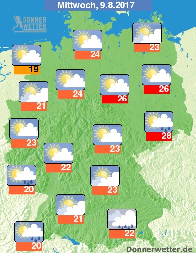 Zu Tagesbeginn halten sich gebietsweise Restwolkenfelder mit letzten Tropfen. Danach gibt es zunächst häufig eine freundliche Mischung aus Sonne und Wolken, wobei sich die Luft im Westen auf 21 bis 25 Grad und im Osten teilweise auf 25 bis 28 Grad erwärmen kann. An der Nordsee bleibt es etwas kühler. Im Laufe des Nachmittags fängt es im Süden bereits wieder an zu brodeln und es entstehen neue Regengüsse, die sich bis zum Abend in die Mitte des Landes ausweiten und örtlich in Begleitung von Blitz und Donner auftreten können. Dabei kann es auch wieder zu kräftigen Schauern kommen. Der Wind weht meist nur schwach bis mäßig, kann aber bei Schauern und Gewittern spürbar auffrischen.