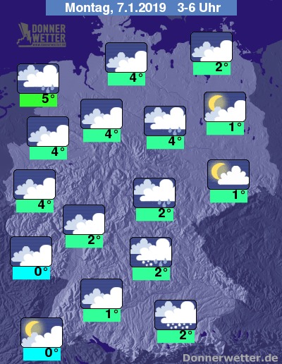 In der Nacht zum Montag ist der Himmel verbreitet stark bewölkt, lediglich im Osten ist es zumeist locker bewölkt, hier und über der Westhälfte des Landes bleibt es weitgehend trocken. Im übrigen Bundesgebiet fällt unter dichten Wolken gebietsweise Regen, Schneeregen oder Schnee. Die Temperatur sinkt auf 5 Grad an der Nordsee und bis 0 Grad am Pfälzer Wald.