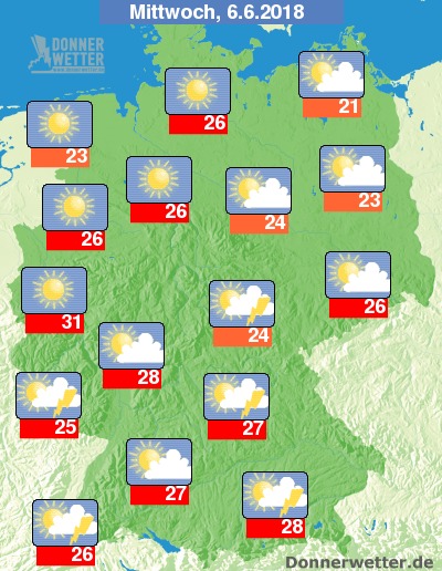 Abgesehen von einigen Schleierwolken oder einigen dichteren hochnebelartigen Wolkenfeldern im Osten, strahlt verbreitet die Sonne. Im Süden und Südwesten bilden sich ab Mittag vermehrt Quellwolken, die gebietsweise dunklere und bedrohlichere Strukturen annehmen können. Dann drohen örtliche Regengüsse und Gewitter, die teilweise wieder kräftig ausfallen und von Platzregen und Hagelschlag begleitet sein können. Die Höchsttemperaturen liegen im Norden und Nordosten bei angenehmen 20 bis 25 Grad. Etwas kühler bleibt es direkt an der See. In der Südwesthälfte werden 25 bis 31 Grad erreicht. Dazu nimmt die Schwüle zu. Der Wind weht meist nur schwach bis mäßig. Lediglich im Nordosten kann der Ostwind zeitweise etwas auffrischen.