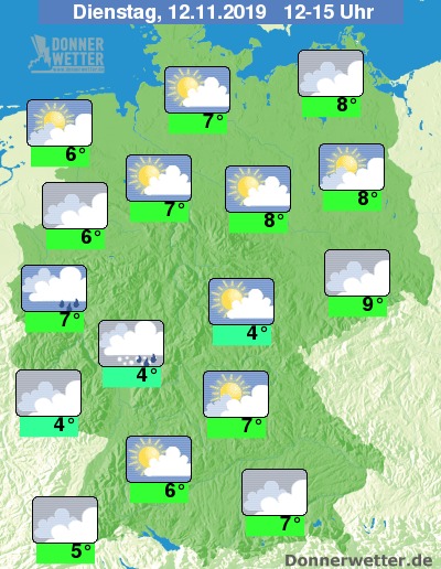Am frühen Nachmittag fällt im Westen aus dichteren Wolken gelegentlich Regen, oder es treten örtliche Schauer auf, in höheren Lagen der Mittelgebirge können sich Schneeflocken unter die Tropfen mischen. Im übrigen Land gibt es eine Mischung aus Sonne und regionalen Aufheiterungen, stellenweise hält sich auch zäher Nebel.