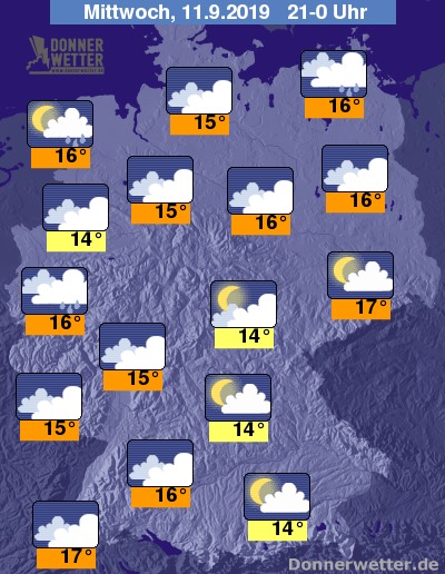 Bis Mitternacht fällt im Westen und Norden aus dichteren Wolken stellenweise etwas Regen. Sonst kann man regional längere Zeit Mond und Sterne beobachten. Oft halten sich jedoch auch dünnere Wolkenfelder.