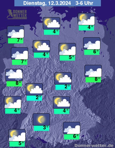 Die Temperaturen gehen in den frühen Morgenstunden zurück auf Werte um 8 Grad in der Kölner Bucht und 2 Grad im Thüringer Becken.