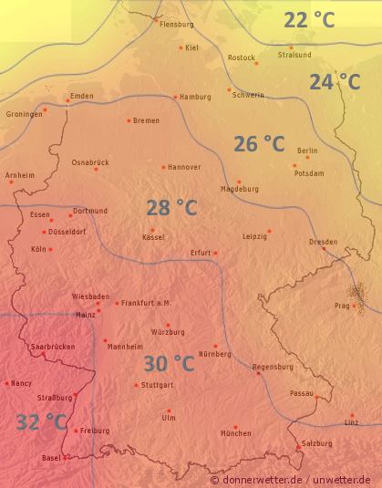 Zunächst strahlt verbreitet die Sonne und heizt die Luft im Tagesverlauf auf 28 bis 34 Grad. Im Norden und Osten bleibt es mit 22 bis 27 Grad erträglicher. Im Laufe des Nachmittags wird es im Westen wolkiger und erste Gewitter können sich entladen. Am Abend drohen von NRW bis Thüringen häufiger teils kräftige Gewitterschauer.