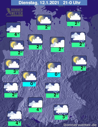 Die Temperaturen sinken bis Mitternacht auf Werte um 4 Grad im Emsland und 0 Grad im Thüringer Becken ab.