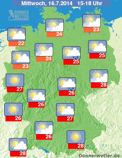 Heute Nachmittag herrscht verbreitet freundliches und trockenes Wetter bei meist nur aufgelockerter Bewölkung. Von Thüringen nach Sachsen-Anhalt ziehen jedoch auch teils dichte Wolken durch, und es kann hier und da einen Schauer geben. Die Temperatur liegt bei meist moderat warmen Sommertemperaturen von 22 Grad an der Nordsee und 28 Grad im Breisgau.