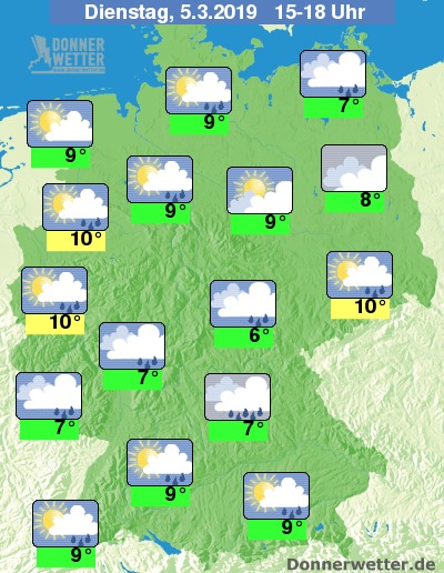 Am Nachmittag dominieren meist kompakte Wolken. Zeit- und Gebietsweise fällt Regen oder es treten Schauer auf. In höheren Lagen der Mittelgebirge können sich Schneeflocken oder Graupelkörner unter die Tropfen mischen. Nur regional gibt es längere trockene Abschnitte mit einigen freundlichen Phasen.