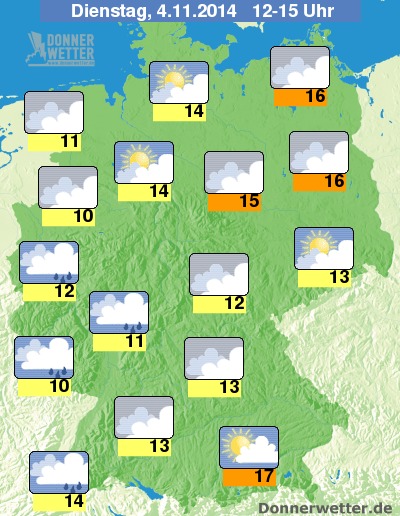 Mit dichten Wolken und Schauern steigen im Westen die Temperaturen so nur auf Werte um 10 bis 14 Grad C, am Alpenrand mit Föhn nochmals um 17 Grad C.