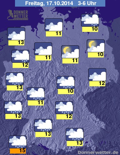 In der Nacht zum Freitag breiten sich von Südwesten her dichte Wolken, mit zum Teil kräftigem Regen aus, sie erreichen bis zum Morgen etwa eine Linie von Ostfriesland über das südliche Niedersachsen bis nach Sachsen. Auch in den anderen Landesteilen ist es meist stark bewölkt, dabei fällt vor allem entlang der Küstenlinie gelegentlich Regen, sonst bleibt es weitgehend trocken. Die Temperatur sinkt auf teils milde 15 Grad in Freiburg und etwa 10 Grad entlang der Elbe.