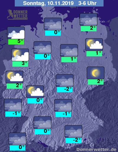 In der kommenden Nacht ist der Himmel sternenklar oder locker bewölkt, lediglich an er Nordsee halten sich oft dichte Wolken, dabei bleibt es trocken. Die Temperatur sinkt auf 5 Grad in Cuxhaven und bis -2 Grad im Eichsfeld.