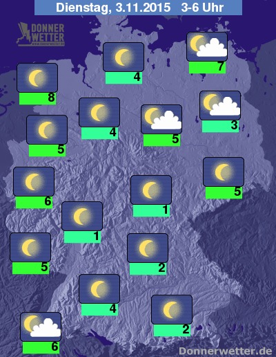 In der Nacht zum Dienstag ziehen nach Nordosten hin noch meist lockere Wolkenfelder durch, im großen Rest des Landes zeigt sich dagegen ein weitgehend sternenklarer Nachthimmel. Hier und da kann sich jedoch Nebel oder Hochnebel bilden. Die Temperatur sinkt auf 8 Grad in Emden und bis 1 Grad am Taunus.