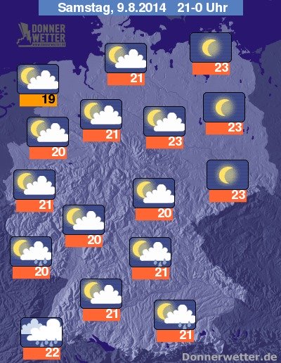 Heute Abend versiegen die Schauer und Gewitter meist sehr rasch, vor allem im Süden sind aber noch vereinzelte Schauer und Gewitter zu erwarten, sonst bleibt es bei meist leichter bis aufgelockerter Bewölkung weitgehend trocken. Vor allem vom Nordosten bis in den Osten Deutschlands zeigt sich der Himmel auch häufig sternenklar. Die abendlichen Temperaturen liegen bei im mediterranen Bereich zwischen 23 Grad in Berlin-Brandenburg und 19 Grad im Emsland.