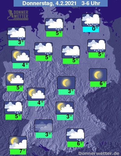 In der Nacht zum Donnerstag zeigt sich der Himmel über der Südhälfte des Landes überwiegend locker bewölkt oder sternenklar. An den Alpen fällt bei meist dichten Wolken jedoch weiterhin zeitweise Regen. Weiter nach Norden hin ist es bedeckt und es fällt häufig Regen, ganz im Norden bzw. im Ostseeumfeld fällt Schnee oder Schneeregen. Die Temperatur sinkt auf 7 Grad in Freiburg und bis 0 Grad in Stralsund.