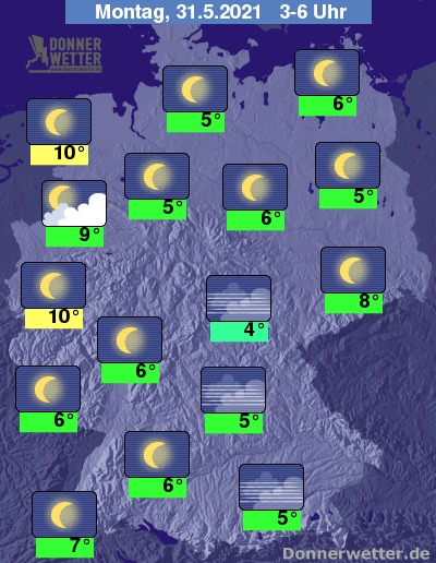 In der kommenden Nacht zeigt sich der Himmel über dem Land verbreitet sternenklar, nur gelegentlich können auch mal wenige Wolken durchziehen, dazu bleibt es trocken. Die Temperatur sinkt auf 10 Grad im Rheinland und bis 4 Grad im Grabfeld.