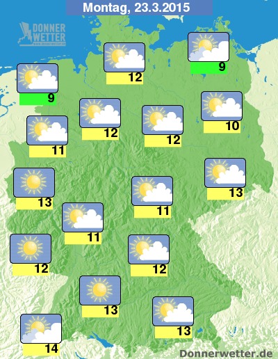 Zum Start in die Woche bleibt es im ganzen Land trocken. Dabei kann sich neben meist lockeren Wolken immer wieder die Sonne zeigen. Gebietsweise, hierbei vor allem im Ostseeumfeld und im Alpenvorland, können die Wolken aber auch mal dicht sein. Die Höchstwerte erreichen 9 Grad an den Küsten und bis 14 Grad in Freiburg.