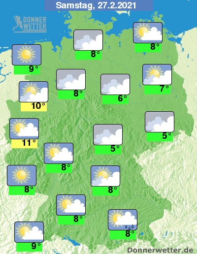 Am Samstag zeigt sich das Wetter im Süden, Westen und an den Küsten überwiegend heiter bis sonnig. Im Rest der Republik ist es hingegen meist stark, teils auch aufgelockert bewölkt, dabei bleibt es trocken. Die Temperatur steigt auf 5 Grad im Vogtland und bis 11 Grad in der Kölner Bucht.