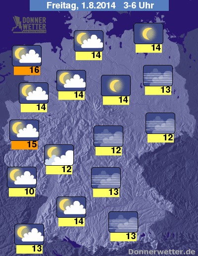 In der Nacht zum Freitag bleibt es besonders in der Osthälfte des Landes meist sternenklar, gebietsweise wird es hier neblig-trüb, weiter nach Westen ziehen auch einige Wolken durch, diese bringen aber ebenfalls keinen Regen. Die Tiefswerte liegen bei 16 Grad an der nördlichen Ems und etwa 10 Grad im Nordpfälzer Bergland.