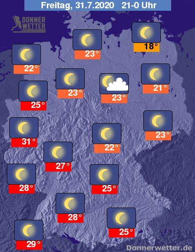 Die Temperaturen liegen am frühen Abend noch bei Werten um 23 Grad an den Küsten und 35 Grad im Breisgau. Am späten Abend leichte Abkühlung auf 31 Grad in der Kölner Innenstadt und 18 Grad an der Nordseeküste.