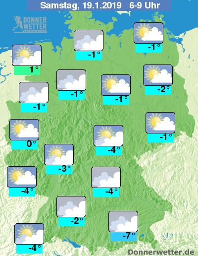 Der Samstag startet verbreitet bedeckt oder aufgelockert bewölkt, entlang der Oder sowie in der Westhälfte sind auch längere heitere Phasen zu erwarten. Schauer bleiben meist aus, die Temperaturen liegen mit Werten um -7 bis 1 Grad C nahezu bundesweit im Frostbereich.