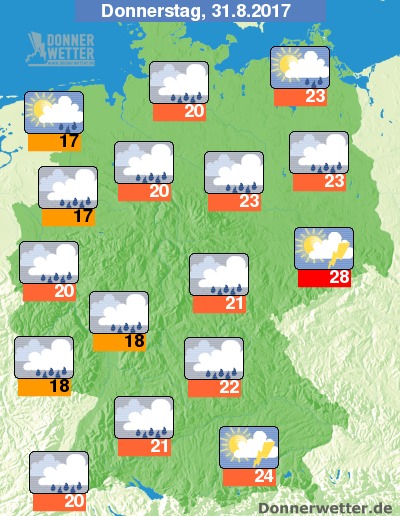 In der Nordwesthälfte dominieren zunächst die Wolken und es kann gebietsweise etwas regnen, oder zu örtlichen Schauern kommen. Im Tagesverlauf stellen sich von der Mosel bis nach Schleswig-Holstein einige Aufheiterungen ein. Die Temperaturen erreichen nur noch 17 bis 22 Grad. Der West- bis Nordwestwind frischt gelegentlich böig auf.