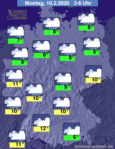 Am Montag überwiegend stark, nur selten auch aufgelockert bewölkt, wiederholt, teils kräftige Schauer. Es weht ein verbreitet starker bis stürmischer Wind, teils herrscht auch im Flachland Sturm. Auf den Bergen und an der See herrscht teils schwerer Sturm oder orkanartigen Böen. Die Temperatur steigt auf 8 Grad an der Müritz und bis 12 Grad in Schwaben.