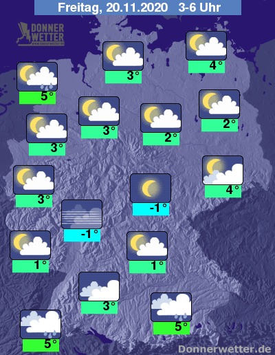 Bis zu den Frühstunden kühlt die Luft auf 0 bis 5 Grad ab. Dort wo die Sterne häufiger und länger zu sehen sind kann es sogar leichten Frost bei Werten um -1 Grad geben.