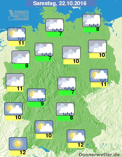 Heute scheint im Süden Deutschlands häufig die Sonne bei oft nur geringer Bewölkung oder auch wolkenlosem Himmel, dazu bleibt es hier trocken. Weiter nach Norden ziehen dagegen viele und oft dichte Wolken durch, dabei fällt gebietsweise auch Regen. Die Temperaturen erreichen nur herbstliche 7 bis 12 Grad.